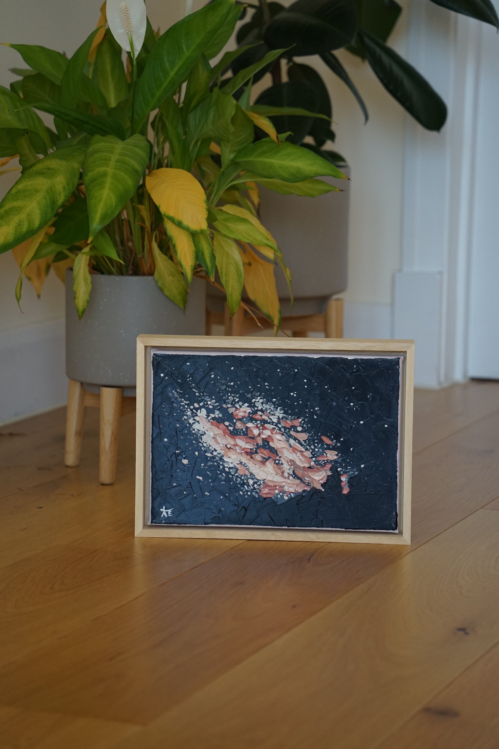Oil painting on stretched canvas. Framed in a natural wooden floater frame, with a 36mm/53mm depth to give your artwork that stunning floating effect. Ready to hang.